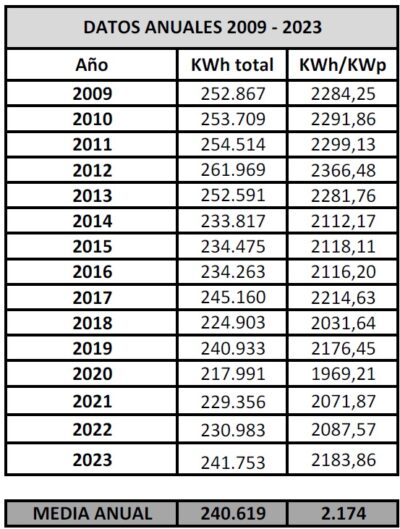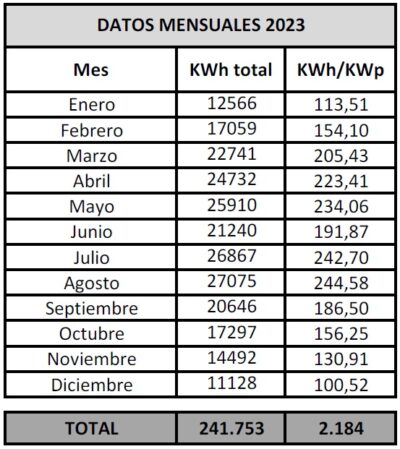 La producción anual de la planta fotovoltaica durante 2023 fue de 241.753 kWh.