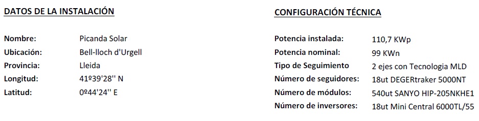 Se trata de una planta solar fotovoltaica de 110,7 kWp y 99 kWn de potencia nominal compuesta por 18 seguidores DEGER 5000NT con 30 módulos Sanyo de 205 Wp.