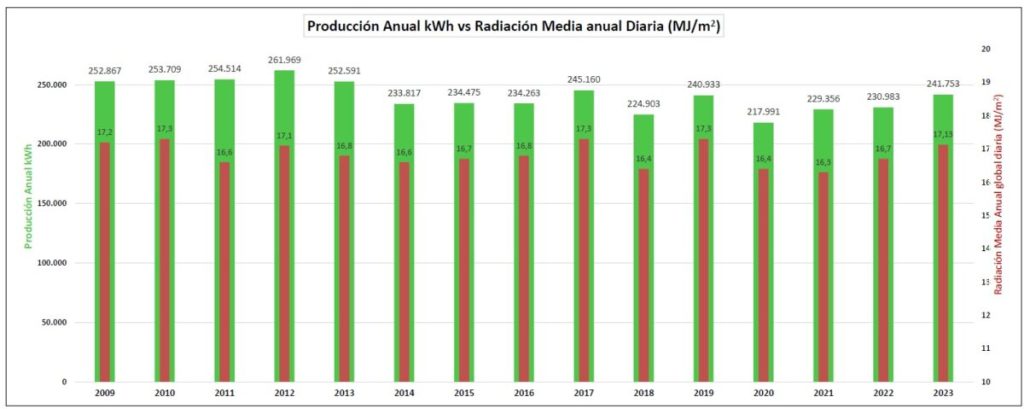 Añadimos a los datos una gráfica ilustrativa de los resultados de producción obtenidos los últimos 15 años, comparándolos con los valores reales de irradiación solar. Hay que tener en cuenta la degradación natural de los módulos solares.